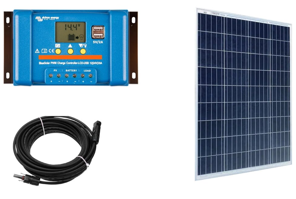 Działa z napięciem podłączonego akumulatora 12V AGM, GEL lub LiFePo (brak w zestawie). Zestaw składa się z jednego (90, 115 i 175 Wp) lub dwóch (90, 115 i 175 Wp) paneli słonecznych Victron Energy, kontrolera słonecznego Victron Energy LCD & USB PWM oraz 15-metrowego zestawu kabli 6 mm2, w tym formowanych złączy MC4. Zestawy z dwoma panelami słonecznymi zawierają również parę połączonych złączy MC4.